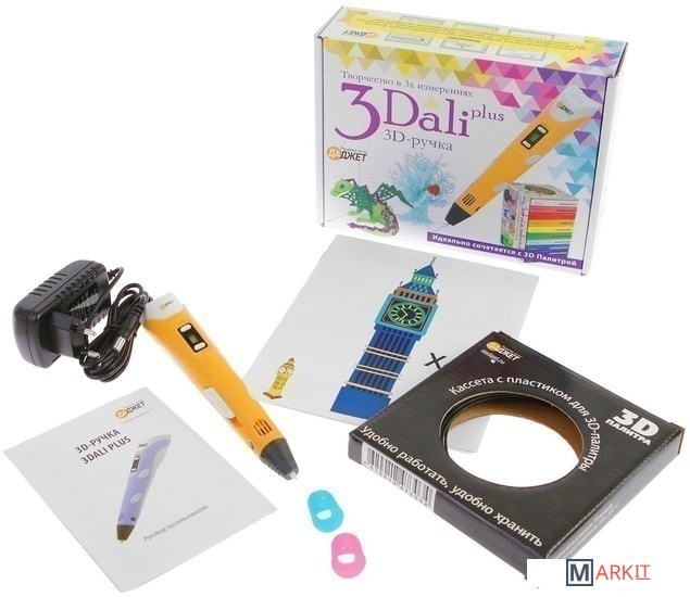 Комплектация | 3D-ручка 3Dali Plus;Адаптер питания;Руководство пользователя;Трафареты;Подставка для ручки;Стартовый набор PLA пластика / 3D-ручка 3Dali Plus;Адаптер питания;Руководство пользователя;Трафареты;Подставка для ручки;10 м пластика ПЛА. |