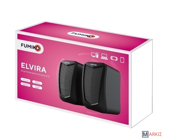 Колонки 2.0 - отличное решение для каждого, кому важен качественный и чистый звук. Модель FUMIKO ELVIRA отлично подходит как для прослушивания музыки, так и для просмотра фильмов. Компактное устройство особенно пригодится владельцам ноутбуков, встроенные динамики которых не способны выдать достаточную мощность и громкость. Новейшие технологии в производстве комплектующих позволили достичь хорошего уровня громкости и чистоты звучания. С источником звука они соединяются с помощью кабеля с разъемом 3.5 мм Jack. Питание происходит от USB - больше никаких лишних проводов. Любимая музыка в громком звучании теперь всегда будет с вами. Длина кабеля позволяет подключить колонки к разъемам на задней панели персонального компьютера.Размер одной колонки 12х8х7 см (высота/глубина/ширина)Общая длина провода 105 смРегулировка громкости на проводе