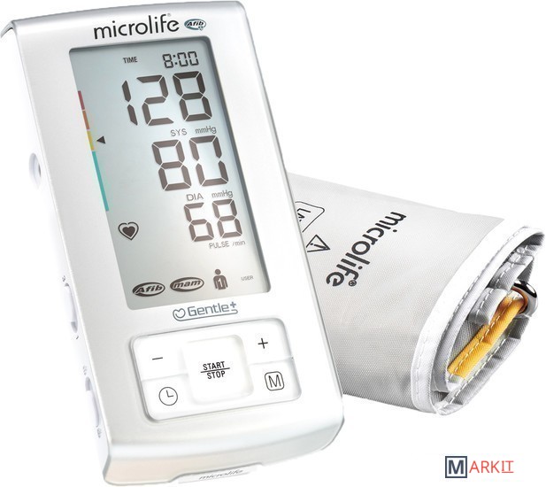 Электронный тонометр Microlife A6 Plus – предупреждение инсульта с помощью самой быстрой диагностики мерцательной аритмии. Рекомендован для домашнего использования, а также для практикующих врачей.Основные преимущества:• AFIB – выявление мерцательной аритмии на 1 и 3 измерениях• MAM – трехкратное измерение показателей давления через 15-секундный интервал и расчет клинически точного среднего значения• Технология Gentle+ – накачивание воздуха в манжете не превышает уровень, необходимый для измерения• Конусообразная манжета M-L размера• Память на 2 пользователей (99 измерений на каждого)• Индикатор движения руки• Индикатор правильно надетой манжеты• Чехол и сетевой адаптер в комплекте