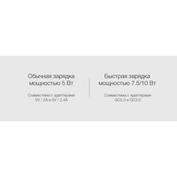 В комплекте кабель USB Type-C.ХАРАКТЕРИСТИКИ ПИТАНИЯВход: 5 В – 2 А (обычный адаптер) или 9 В – 1,6 А (адаптер с поддержкой Quick Charge 2.0/3.0)Выход5 Вт – 5 В – 1 А (с обычным адаптером) или 10 Вт – 9 В – 1,1 А (с адаптером с поддержкой Quick Charge 2.0/3.0)