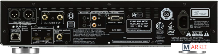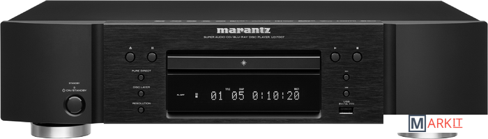 Проигрыватель Marantz UD7007 может по праву считаться универсальным источником сигнала для современной системы домашнего кинотеатра. Кроме возможности воспроизведения дисков любых типов, этот аппарат оснащен USB-разъемом и Ethernet-интерфейсом, и может работать в домашней сети по протоколу DLNA 1.5. При этом по сети возможно воспроизведение аудио/видео файлов большинства популярных типов, в том числе FLAC и DivX plus HD. Кроме того, плеер может подключаться к сети Интернет, и работать с такими ресурсами, как YouTube или Netflix. Разумеется, встроенное программное обеспечение может быть со временем обновлено, и функционал Marantz UD7007 еще более расширится. К разъему USB можно подключать портативные накопители со сжатыми музыкальными файламиВ плеере Marantz UD7007 имеется полная поддержка BD Live, для которой аппарат оснащен встроенной памятью объемом 1 Гб. Для подключения видеоустройств предусмотрен новейший интерфейс HDMI 1.4a с поддержкой 3D видео, еще один HDMI-выход предназначен для подачи аудиосигнала на ресивер. Через HDMI можно также выводить DSD-поток с дисков SACD. Также поддерживаются аудофильские диски DVD-Audio. Многоканальный звук можно выводить также и через аналоговые аудиовыходы плеера в режиме downmix. Видеосигнал, имеющий разрешение ниже FullHD, может быть подвергнут апскейлингу до 1080р перед выводом через HDMI.