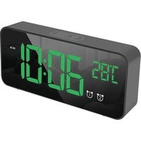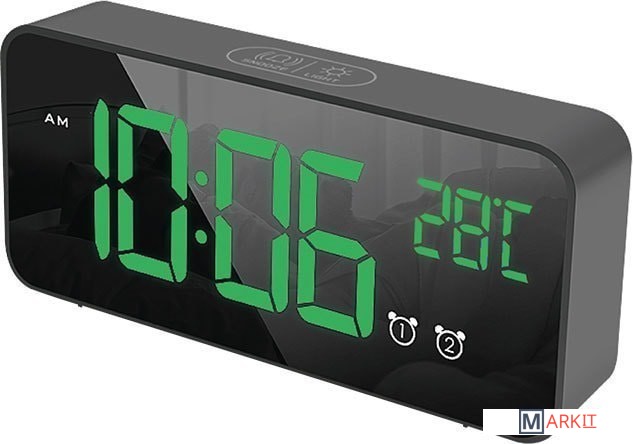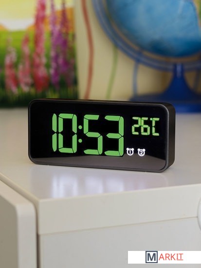 Особенности:— Современный дизайн— Возможность работы от аккумулятора/USB/сети— Яркие, заметные издали цифры— Регулируемая яркость— Запоминание настроек при отключении питания— Качественный приятный звук будильника— Встроенный термометр