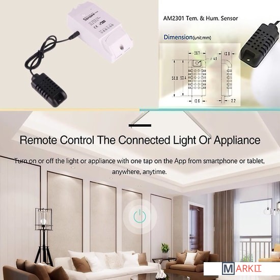 Цифровой датчик температуры и влажности Sonoff AM2301 для устройств удаленного управления и мониторинга.Данный датчик является дополнением (опцией), для использования с устройствами Sonoff TH10/TH16 и снабжен специальным разъемом для подключения к этим устройствам.При управлении выключателем Sonoff TH10/TH16 датчик Sonoff AM2301 позволяет использовать функции, зависящие от температуры и влажности, измеряемые датчиком.Датчик должен быть подключен к Sonoff TH10/TH16, до включения питания модуля. Не рекомендуется подключать или отключать датчик после включения питания.Датчик оснащен кабелем и 2,5 мм. штекером.- Датчик не является водонепроницаемым датчиком.- Для корректной работы датчика температуры AM2301 допускается длина до 60 метров.- Диапазон рабочей температуры: от -40 до +80;- Диапазон рабочей влажности: от 0 до 99.9%RH;- Точность измерения при температуре 25°С (температура): ±0.5%RH;- Точность измерения при температуре 25°С (влажность): ±3%RH(10...90%RH);- Тип сенсора (температура): резистивный датчик;- Тип сенсора (влажность): емкостный датчик;- Напряжение питания: 3.0-5.2V (рекомендуется 5V);- Длина (кабель с датчиком): 0.5 метра;- Максимально расширяемая длина: до 60 метров;- Разъем: jack 2,5мм.;- Размер датчика: 60x30x19 мм;