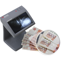 Удобный угол расположения экрана. Наклейка с изображением ИК-меток банкнот Банка России в комплекте поставки. Супер компактные размеры. Несмотря на небольшую высоту детектора, камера с большим углом обзора обеспечивает широкий обзор банкноты на дисплее. Быстрый просмотр банкнот «веером».