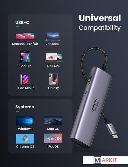 Концентратор UGREEN 7 в 1 USB-C оснащен портом Ethernet 1000 Мбит/с, портом HDMI 4K@60 Гц, портом для зарядки USB C с мощностью 100 Вт, устройством чтения карт SD/TF и 2 портами USB 3. 0. Подключайтесь к новейшим MacBook Pro или устройствам USB-C с помощью многопортового адаптера, чтобы обеспечить удобство в работе.Просто подключите порт HDMI, и вы сможете проецировать видеоконтент UHD 4K@60Hz/30Hz или Full HD 1080p 60Hz на HDTV, мониторы или проекторы. Проецируйте фильмы, презентации или видеоигры на мониторы в один клик. (Примечание: 4K@60Hz доступно только для ноутбуков с поддержкой DisplayPort 1.4 и 8K).Док-станция оснащена встроенным входом Type-C, что позволяет заряжать устройства, имея доступ к нескольким периферийным устройствам. Мощность распределяется между всеми подключенными к док-станции устройствами USB-C и регулируется в зависимости от потребностей. Концентратор выдает около 95 Вт для зарядки подключенного ноутбука и 5 Вт для питания концентратора при подключении к 100-ваттному входу питания.Порт Ethernet 1000 Мбит/с обеспечивает более стабильное и быстрое подключение к проводной сети (Примечание: для получения скорости 1 Гбит/с требуется порт LAN маршрутизатора, кабель CAT5e и высокоскоростной драйвер Ethernet). Порт RJ45 может распознавать скорость интернета и автоматически настраивается на самый высокий уровень, независимо от того, является ли она 10/100/1000 Мбит/с.2* порта USB 3.0 поддерживают скорость передачи данных до 5 Гбит/с, достаточно быструю для передачи HD-фильмов за считанные секунды. Также идеально подходит для подключения клавиатуры, мыши, флэш-накопителей и других периферийных устройств, подключаемых через порт USB A. Устройство чтения карт SD TF (скорость до 104 Мб/с) для устройств USB-C/Type-C/Thunderbolt 3 для доступа к файлам с устройств чтения карт SD/TF.