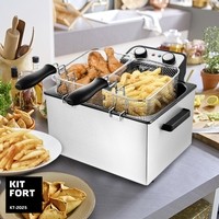 Kitfort KT-2025 укомплектована тремя корзинами для жарки — одной большой и двумя маленькими. Малые корзины вы можете устанавливать во фритюрницу одновременно. Это удобно, если вы хотите приготовить два различных блюда.