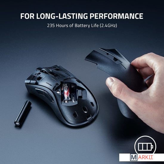 Технология высокоскоростной беспроводной связи Razer HyperSpeed Wireless позволит вам раскрыть свои истинные возможности благодаря беспроводному подключению со сверхнизкой задержкой.Способна работать от одной батареи AA (входит в комплект мыши) или AAA, гибридный слот мыши для батареи позволяет увеличить время автономной работы или уменьшить вес — и все это оптимально расположено для идеального баланса мышки.Независимо от того, настраиваете ли вы основные команды или создаете самые продвинутые макросы, все необходимое управление будет у вас под рукой благодаря 2 уникальным кнопкам быстрого доступа на кромке и 2 боковым кнопкам.Будьте готовы к игре в любом месте с настроенными биндами на кнопках, макросами и удвоенным назначением кнопок с помощью функции Razer Hypershift.Эта беспроводная эргономичная игровая мышь плавно скользит по любой поверхности благодаря ножкам, сделанным из чистейшего высококачественного фторопласта.Время работы от батарейки: до 235 часов (2,4 ГГц), 615 часов (Bluetooth LE) от алкалиновой AA батарейкиВремя работы от батарейки: до 144 часов (2,4 ГГц), 369 часов (Bluetooth LE) от алкалиновой AАA батарейки