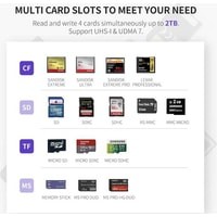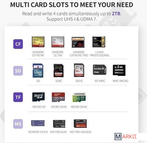 Поддержка карт (без адаптера) CompactFlash, SD, SDHC, SDXC, microSD, microSDHC, microSDXC, Memory Stick, Memory Stick Duo, Memory Stick PRO HG Duo, MMCmicro, RS-MMC