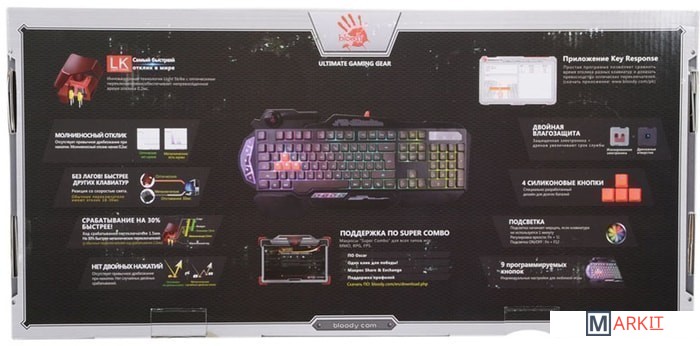 4 Light Strike переключателя. Инновационная технология Light Strike использует оптические переключатели, обеспечивающие молниеносное время отклика до 0.2 мс! Оптический переключатель обладает высокой долговечностью, ультрапрочностью и износостойкостью, что делает его привлекательным для геймеров.Ход срабатывания оптических переключателей 1.5 мм - на 30% быстрее металлических переключателей (у обычных переключателей ход срабатывания - 2.2 мм).Реагирует на световых скоростях без задержек (обычные металлические переключатели имеют время отклика 18-30 мс).Защищенная электроника + дренажные отверстия увеличивают срок службы клавиатуры.Нажатие Fn+F8 деактивирует клавишу "Windows" для предотвращения случайного вылета из игровой сессии.Широкая подставка для запястья обеспечивает более комфортную игру и меньшую усталость.Клавиатуры серии Bloody обладают эргономичным дизайном и высоким качеством производства с использованием передовых технологий. Тщательный контроль исполнения деталей, удобство и эргономичность по праву поднимают клавиатуру на топовые позиции среди аналогичных устройств. Клавиатуры Bloody предназначены для полного погружения в игровой процесс.