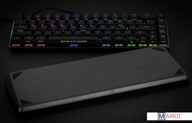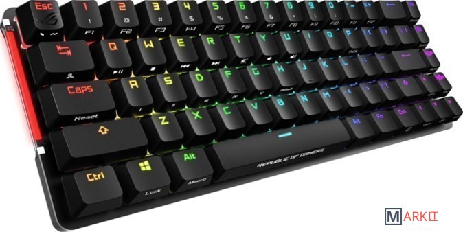 ROG Falchion: беспроводная механическая игровая клавиатура формфактора «65%» с 68 клавишами, подсветкой Aura Sync в беспроводном режиме, интерактивной сенсорной панелью, переключателями Cherry MX, со временем автономной работы до 450 часовКлавиатура без кириллицы.