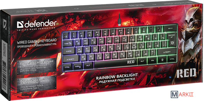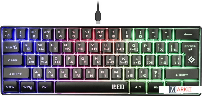 Компактная конструкция экономит пространство рабочего столаОтключаемый кабель с разъемом Type СКабель можно отключить для удобства переноски клавиатурыСпециальные игровые функции: блокировка системных клавиш Windows и переключение стрелок курсора на кнопки WASD**Блокировка системных клавиш: нажмите и удерживайте клавишу Fn, затем нажмите клавишу Windows - системные клавиши заблокируются. Чтобы разблокировать клавиши, повторите действие. Переключение клавиш W, A, S, D в игровой режим. Нажмите и удерживайте_ Fn, одновременно нажмите_W. Клавиши W, A, S, D переходят в режим стрелок, [↑][←] [↓] [→] соответственноФункция Anti-ghost23 клавиши: Q, A, Z, W, S, X, E, D, C, B, F, T, Y, U, 4, 6, 0, BACK, ], ENTER, /?, Space, TabРадужная подсветкаДля смены режима подсветки используйте комбинацию клавиш "FN+K"Возможность выключения подсветкиКнопки FN+I для включения и выключения подсветкиРегулируемая яркость подсветкиИспользуйте комбинацию клавиш "FN + O" для усиления и комбинацию "FN + L" для снижения яркости подсветкиПовышенная износостойкостьУправление скоростью динамической подсветки FN+стрелки влево/вправо