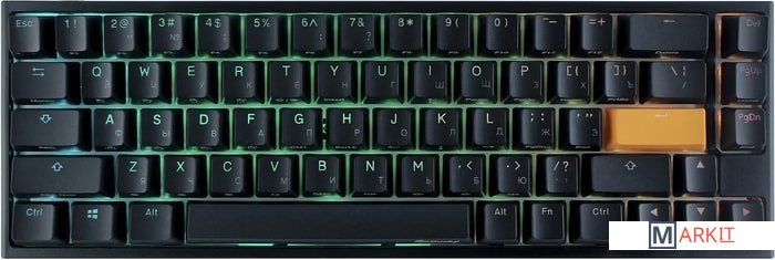 RGB подсветкаПрисутствует множество различных режимов, регулировка цвета осуществляется через палитру или отдельную настройку красного, зеленого, синего цветов. Также можно создать кастомный режим статичной подсветки.ПрограммируемаяDucky Macro 2.0 дает возможность создавать макросы. Можно создать свои мультимедиа, функциональные макросы и многое другое.Регулируемые ножкиДвойные регулируемые ножки предоставляют целых два угла наклона клавиатуры для более комфортной печати, а их прорезиненный низ не даст клавиатуре сдвинуться с местаРусифицированные PBT double-shot клавишиИзготовлены из высокопрочного пластика PBT с применением double-shot технологии, что гарантирует их долговечность и надежность в эксплуатации.DIP-переключателиДают возможность поменять расположение клавиши FN и переключиться между NKRO и 6KRO.Функция Full N-key Rollover по USB (NKRO)Позволяет нажимать одновременно неограниченное количество клавиш. Для печати идеально подойдет как 6KRO, так и NKRO независимо от вашей скорости. Для игр NKRO будет плюсом и неважно, нажимаете ли вы больше 6 кнопок или нет, поскольку, играя в любую игру, вы можете случайно нажать пару лишних клавиш и из-за этого клавиатура имеет шанс не среагировать на нажатие, которые вы хотели совершить изначально. Также присутствует возможность переключения на 6KRO.