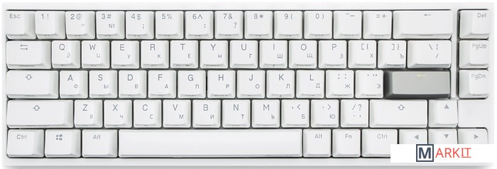 RGB подсветкаПрисутствует множество различных режимов, регулировка цвета осуществляется через палитру или отдельную настройку красного, зеленого, синего цветов. Также можно создать кастомный режим статичной подсветки.ПрограммируемаяDucky Macro 2.0 дает возможность создавать макросы. Можно создать свои мультимедиа, функциональные макросы и многое другое.Регулируемые ножкиДвойные регулируемые ножки предоставляют целых два угла наклона клавиатуры для более комфортной печати, а их прорезиненный низ не даст клавиатуре сдвинуться с местаРусифицированные PBT double-shot клавишиИзготовлены из высокопрочного пластика PBT с применением double-shot технологии, что гарантирует их долговечность и надежность в эксплуатации.DIP-переключателиДают возможность поменять расположение клавиши FN и переключиться между NKRO и 6KRO.Функция Full N-key Rollover по USB (NKRO)Позволяет нажимать одновременно неограниченное количество клавиш. Для печати идеально подойдет как 6KRO, так и NKRO независимо от вашей скорости. Для игр NKRO будет плюсом и неважно, нажимаете ли вы больше 6 кнопок или нет, поскольку, играя в любую игру, вы можете случайно нажать пару лишних клавиш и из-за этого клавиатура имеет шанс не среагировать на нажатие, которые вы хотели совершить изначально. Также присутствует возможность переключения на 6KRO.
