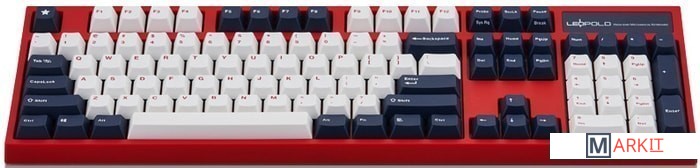 КЛАВИАТУРА БЕЗ КИРИЛЛИЦЫТип: тактильныйСила нажатия: 65 грамм (тяжелые)Длина пути: 4 мм (2 мм до срабатывания)Данная модель имеет красно-белую расцветку с тёмно-синими клавишами-модификаторами — очень смелое и яркое цветовое решение. Клавиатура собрана добротно и монолитно, а сочетание высококачественных double-shot PBT клавиш с переключателями Cherry MX и звукопоглощающей подложки позволяет сделать печать на клавиатуре максимально тихой (насколько это возможно для механики). Mini-USB порт спрятан в центре под корпусом, а на самой клавиатуре имеются центральная и две боковые канавки под кабель.Клавиатура поддерживает сочетание клавиш для регулировки громкости и управления музыкой, также имеется возможность переключения между 6KRO и NKRO.DIP-переключатели на задней панелиДают возможность поменять местами функции кнопок Ctrl и Caps Lock, Windows и Alt, Windows и Fn или отключить Windows.Звукопоглощающая подложкаПоглощает звуки при нажатии, делая процесс печати более тихим по сравнению с обычными механическими клавиатурами.Низкопрофильные клавиши Step-Sculpture2Данные клавиши заметно ниже и имеют оптимальный угол наклона, из-за чего, по отзывам, печатать приятнее и комфортнее, чем на более высоких клавишах.Клавиатура совместима с Mac OSFN-слой работает (кроме клавиш F6, F8, F9), а поменять местами клавиши-модификаторы можно в системных настройках. Проверено с MAC OS 10.13Функция Full N-key Rollover по USB (NKRO)Позволяет нажимать одновременно неограниченное количество клавиш. Для печати идеально подойдет как 6KRO, так и NKRO, независимо от вашей скорости. Для игр NKRO будет плюсом и неважно, нажимаете ли вы больше 6 кнопок или нет, поскольку, играя в любую игру, вы можете случайно нажать пару лишних клавиш и из-за этого клавиатура имеет шанс не среагировать на нажатие, которое вы хотели совершить изначально. Имеется возможность переключения между NKRO и 6KRO через FN сочетания.