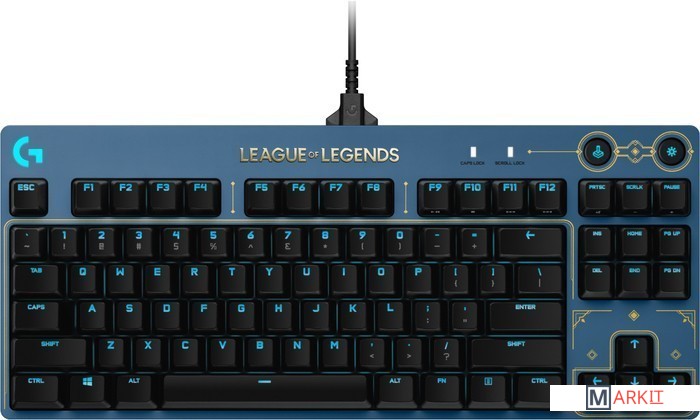 И наконец клавиатура для League of Legends. Мы оформили клавиатуру PRO, которая прекрасно зарекомендовала себя на турнирах, в стиле игры League of Legends. Теперь вы можете погрузиться в игру с головой и сокрушить своих врагов. Благодаря компактной конструкции и отсутствию цифрового блока, а также высококлассным переключателям с тактильным откликом эта клавиатура станет вашим незаменимым помощником в игре League of Legends и других.Благодаря отсутствию цифрового блока эта клавиатура оставляет больше места для работы с мышью, а съемный кабель позволяет с удобством перевозить устройство. Поэтому его можно без проблем брать с собой как на рейтинговый матч, так и для простой игры с друзьями.Система подсветки дает возможность визуально выделить важные клавиши или наглядно подчеркнуть принадлежность игрока к определенной команде. Эффекты и анимацию подсветки можно настроить с помощью ПО G HUB. Кроме того, оно позволяет сохранять статичные схемы подсветки во встроенной памяти устройства для дальнейшего использования на турнирах.Съемный кабель microUSB позволяет безопасно перевозить клавиатуру в дорожной сумке. Штекер имеет особую конструкцию: помимо собственно разъема, на нем есть еще два фиксирующих выступа, которые обеспечивают максимально удобное и надежное подключение.Резиновые ножки придают клавиатуре отличную устойчивость, которая так важна во время напряженных игровых сеансов. Трехпозиционная система регулировки позволяет установить устройство под наиболее удобным углом.