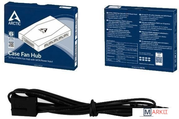 Контроллер для подключения до десяти вентиляторов с PWM.Питание - SATAВентиляторы питаются напрямую от вашего блока питания через Sata Power. В результате отсутствует потеря напряжения и скорости вращения вентилятора, становится возможной более плавная работа.ШИМ-сигнал синхронно передается на все вентиляторы, подключенные к Case Fan Hub. Обороты первого слота вентилятора считываются и возвращаются в вашу систему.