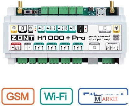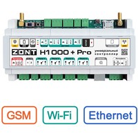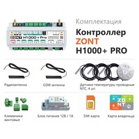 Универсальный контроллер ZONT H1000+ PRO обладает широким функционалом и подходит для контроля и управления сложными системами отопления. Прибор является улучшенной версией контроллера ZONT H1000+ и соответствует профессиональным стандартам ZONT.Контроллер ZONT Н1000+ PRO предназначен для профессиональной автоматизации инженерных систем и дистанционного управления ими. Контролирует и управляет системой отопления с функцией приготовления горячей воды.Прибор обладает возможностями гибкого программирования для решения задач автоматизации котельной. Алгоритм работы контроллера может учитывать температуру наружного воздуха и недельное расписание. Прибор дистанционно управляет работой инженерных исполнительных устройств, а также любых элементов домостроения по расписанию, сценариям, срабатыванию контролируемых датчиков.ZONT H1000+ PRO управляется автоматически по запрограммированному алгоритму или вручную – через личный кабинет веб-сервиса, мобильное приложение. Контроль параметров системы отопления и состояния подключенного оборудования доступен из личного кабинета веб-сервиса, мобильного приложения и через голосовую связь.Контроллер ZONT H1000+ PRO стоит выбрать для: автоматического контроля режимов работы прямых и смесительных контуров системы отопления; контроля режимов работы и технического состояния котла; контроля заданных и текущих температур и оперативного изменения их значений;автоматизации работы компонентов инженерной системы с удаленным управлением и контролем;запрограммированного управления элементами домостроения;удаленного управления приборами;мгновенного оповещения при возникновении аварии котла, при отклонении текущих параметров от заданных значений;контроля и автоматического реагирования системы безопасности и охраны.GSM-модем встроенный, поддерживает 2GЧастотный диапазон 800, 900, 1800, 1900 MHzУправляемые выходы:4 релейных выхода2 универсальных входа/выхода «открытый коллектор»4 входа NTC1 аналоговый выход 0-10 ВКомплектация датчиками NTCВстроенный резервный АКБКнопка перезагрузкиГабариты корпуса 180 х 90 х 60 мм