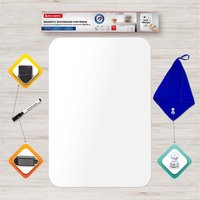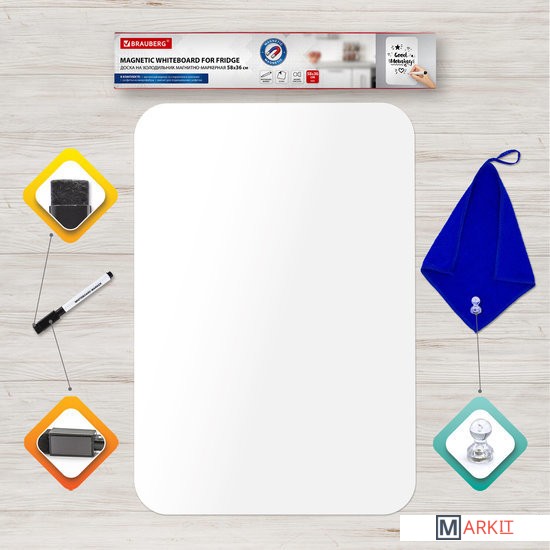 Магнитно-маркерная доска BRAUBERG на холодильник предназначена для письма маркерами для белых досок и меловыми маркерами. Это гибкая магнитная доска, которая легко крепится к гладким металлическим поверхностям и не требует дополнительной фиксации.Это идеальный инструмент для личного планирования, заметок или переписок со своими домочадцами, рисования или черчения графиков, ведения учёта калорий, продуктов, необходимых для покупки. Доска замечательно подходит для развития творческих способностей. Имеет многоразовую поверхность «пиши-стирай», выполненную из ПВХ.В комплекте: черный маркер для белых досок с магнитом и стирателем в колпачке, салфетка из микрофибры (с «ушком» для подвешивания) и магнит специальной формы, удобной для подвешивания салфетки. Во избежание преждевременного высыхания маркер рекомендуется хранить на холодильнике, колпачком вниз.Поверхность доски не боится воды, но избегайте попадания воды на края во избежание расслаивания.Для очистки доски используйте влажную салфетку.Корректируйте записи при помощи стирателя, встроенного в колпачок маркера.Размер доски 58х36 см (крупный формат), так что вы легко уместите на неё всю важную информацию и еще останется достаточно места для творчества!Важно! НЕ ИСПОЛЬЗОВАТЬ перманентные маркеры!