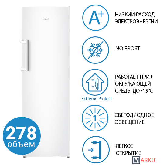 Новая модель морозильников ATLANT 2017 года - серия ADVANCE.Высота модели М-7606-N 1868 мм, общий объем 278 л.В морозильнике предусмотрено 8 отделений различной вместительности.Преимущества наличия системы No Frost в морозильнике ATLANT: равномерное распределение охлажденного воздуха; быстрое охлаждение продуктов; отсутствие инея в морозильнике.В сравнении с предыдущими моделями, морозильники данной серии обладают более высоким классом энергоэффективности – А+.Новый дизайн: конструкция двери High Door, лаконичные формы, эргономичная вертикальная ручка-скоба, верхняя корзина с откидной панелью для удобства эксплуатации.Улучшены потребительские свойства холодильника: электронное управление Touch Control, LED освещение, режим суперзамораживания, наличие звуковой сигнализации с возможностью ее отключения.Более эффективно организовано пространство: наличие поддона для замораживания ягод и др. мелких продуктов, увеличенного отделения Big Box для замораживания и хранения крупногабаритных продуктов, двух емкостей Slim Space на двери морозильной камеры, формы для льда.Максимальный диапазон климатических классов: SN, N, ST, T (стабильная работа при температуре окружающей среды от 10 до 43°C).