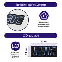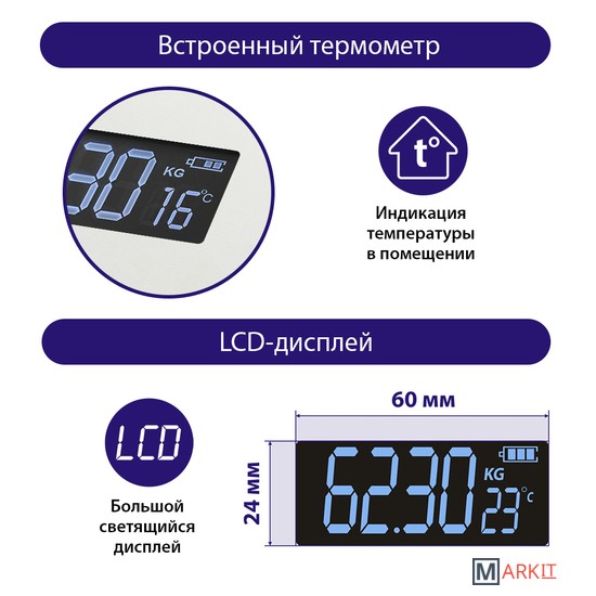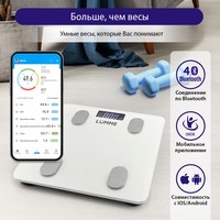 Функциональные особенности | расчет доли воды, расчет доли жировой ткани, расчет доли мышечной ткани, расчет доли костной ткани, расчет ИМТ (BMI), индикация температуры помещения, индикация заряда батареи |
