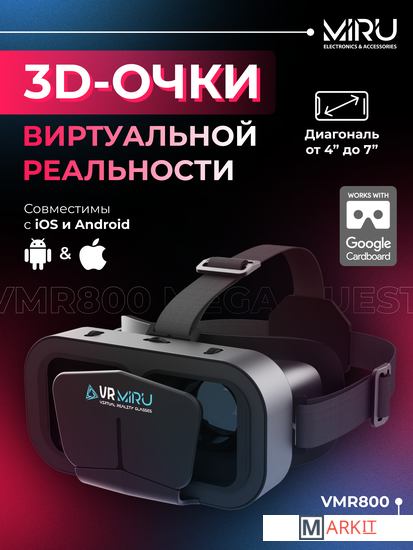 Очки виртуальной реальности от MIRU Mega Quest VMR800 позволяют смотреть 3D-фильмы или играть в игры в виртуальной реальности. Все, что вам нужно сделать, это загрузить игры или фильмы, отмеченные символом VR или Google Cradboard из магазина приложений (APP Store или Google Play Store) на свой смартфон, и очки быстро перенесут вас в виртуальный мир фильмов с обзором на 360 градусов, 3D- или VR-игр. В корпусе можно разместить смартфон с размером экрана от 4 до 7 дюймов на Android или iOS. В устройстве легко помещаются смартфоны шириной 65-85 мм и максимальной высотой 170 мм. Благодаря использованию асферических линз, не искажающих изображение, мы получаем максимальное впечатление естественности и глубины изображения, а их двусторонняя регулировка позволяет индивидуально настроить устройство как под размер смартфона, так и под расстояние между зрачками. Защитный чехол из качественной искусственной кожи, наполненный эластичной губкой, не только обеспечивает удобство использования, но также позволяет подобрать очки к форме лица и позволяет использовать очки виртуальной реальности, не снимая ваши очки для зрения. Прочные ремешки из эластичной резины надежно удерживают очки на голове. Конструкция позволяет использовать камеру телефона (необходимо для игр «Дополненная реальность»). Очки имеют вентиляционные отверстия и вырезы по бокам для подключения наушников и кабеля для зарядки смартфона. Чтобы в полной мере использовать возможности VR-игр, рекомендуется использовать смартфоны, оснащенные гироскопом.