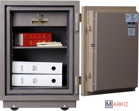 - при заливке двери и корпуса сейфа используется запатентованный состав огнестойкого бетона- тепловой замок, усиленный огнестойким уплотнителем- оборудован колесами- комплектуются двумя ключевыми замками- предусмотрено анкерное крепление к полу (испытание на огнестойкость проведено с анкерным отверстием)