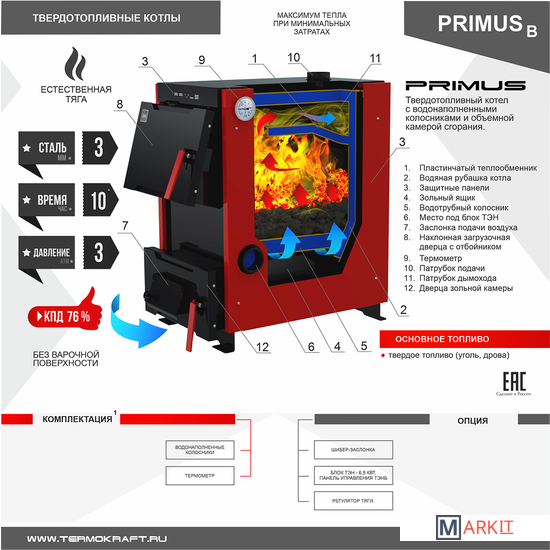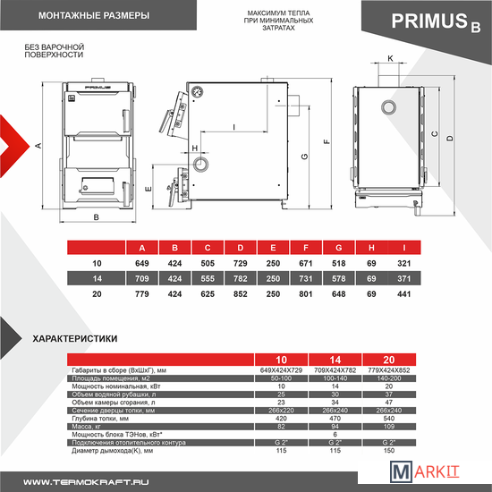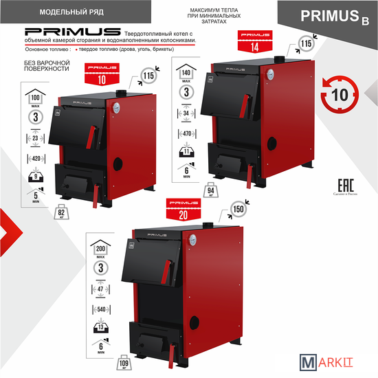 - Котлы PRIMUS предназначены для отопления индивидуальных жилых домов и зданий коммунально-бытового назначения, оборудованных системами водяного отопления с естественной или принудительной циркуляцией, а также приготовления пищи.- Особенностями данного котла являются небольшие габаритные размеры, экономичность, надежность, простота обслуживания и эксплуатации. Благодаря продуманной конструкции котлы легко обеспечивают нагрев воздуха в помещениях площадью до 200 м2.- Различная производительность котлов позволяет подобрать модель с такой мощностью, которая гарантирует самую высокую эффективность и наиболее экономичную работу.