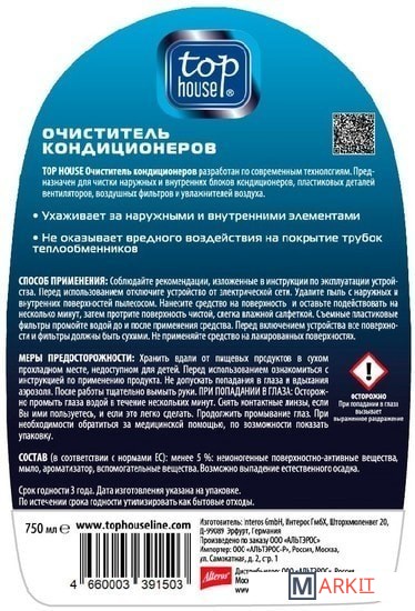 Очиститель кондиционеров TOP HOUSE специально разработан и произведен в Германии для чистки наружных и внутренних блоков кондиционеров, сплит-систем, стационарных пластиковых воздушных фильтров, декоративных решеток воздушных фильтров, пластиковых направляющих и лопастей вентилятора.Не оказывает вредного воздействия на покрытие трубок теплообменников.При разработке формулы были учтены рекомендации ведущих европейских производителей кондиционеров.Оказывает сильное антистатическое действие.Препятствует оседанию пыли и освежает поверхность.Обладает антибактериальным эффектом.
