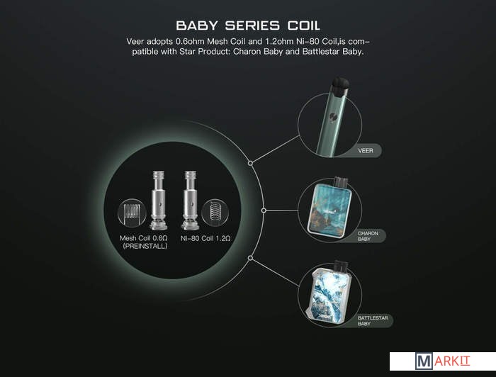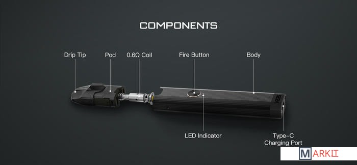 - сеточный испаритель 0.6 Ом- спиральный испаритель 1.2 Ом- кабель для зарядки- документация |