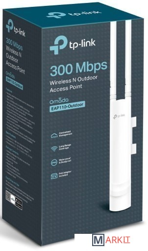 EAP110-Outdoor обладает 2 всенаправленными съёмными антеннами – это значит, что их можно заменить на те, которые будут больше подходить вашим требованиям.Пассивное PoE позволит не подключать к точке доступа адаптеры и кабели питания – установка на улице будет быстрее и проще.EAP110-Outdoor может быть легко установлен на стене или мачте с помощью монтажных креплений, идущих в комплекте.Комплект поставки: N300 Наружная Wi-Fi точка доступа EAP110-OutdoorАдаптер пассивного PoEКабель питанияМонтажный наборВодонепроницаемая резиновая прокладкаВодонепроницаемые антенныРуководство по установке