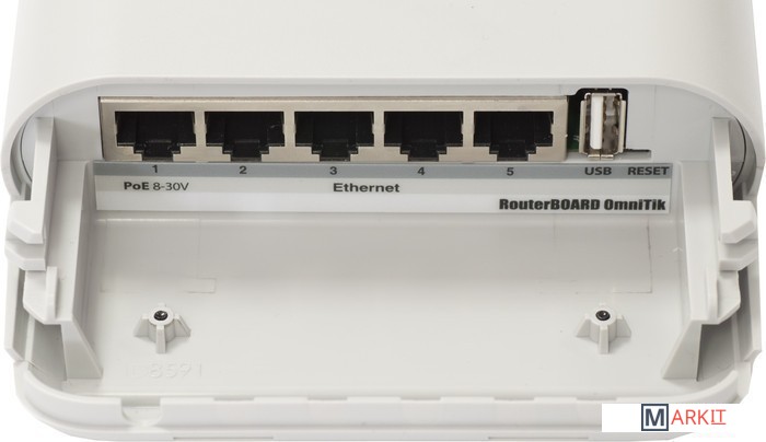 Mikrotik RouterBOARD OmniTIK U-5HnD - беспроводная базовая станция внешнего исполнения для работы в диапазоне 5ГГц с интегрированными всенаправленными антеннами 7.5 dBi MIMO 2x2, работает в режиме 802.11a/n MIMO 2x2, имеет защиту от перенапряжения по антенному входу и 5 сетевых портов Ethernet 10/100M. USB порт для подключения 3G-модема.